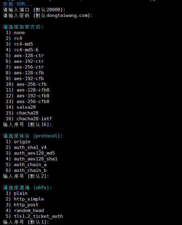 端口、密码、加密方式、协议、混淆,全部回车,或者自己输入或选择想要的。