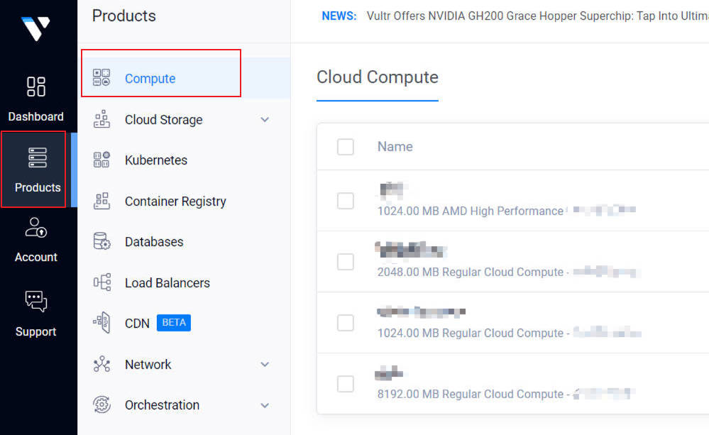 点击Products——Compute就可以看到购买的服务器列表