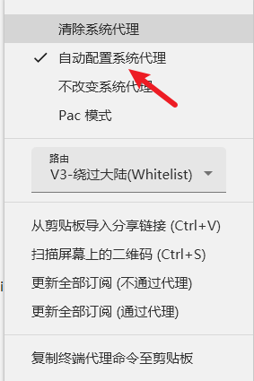 第四步,在任务栏中右键v2rayN图标,选择“自动配置系统代理”,之后就可以通过浏览器翻墙了。