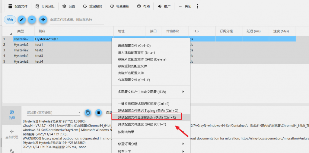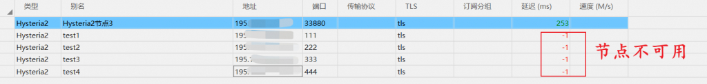 选中所有节点,选择“测试真链接”,如果延迟结果是“-1”,那么该节点不可用,反之节点可用。