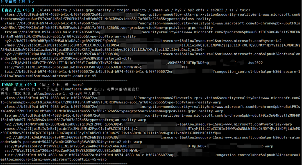 一键安装sing-box脚本,开箱即用 18 个节点(直连 9 + WARP 9),含端口一键切换、BBR 加速、分享链接导出等。支持系统:Debian 11+ / Ubuntu 20.04+ / CentOS Stream 9+ / Rocky 9+ / AlmaLinux 9+ / Fedora 38+ / Arch(rolling) / openSUSE Leap 15.4+,已在Vultr 上测试通过。脚本地址:Alvin9999-newpac/Sing-Box-Plus