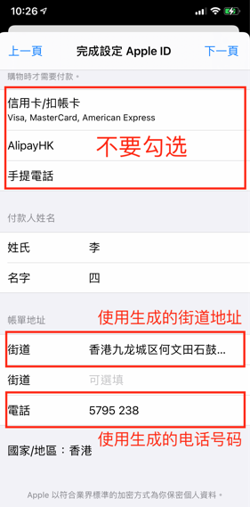付款人姓名保持原样,然后在下方填入香港账单地址和电话(街道地址和电话可在 https://www.meiguodizhi.com/hk-address 生成)。